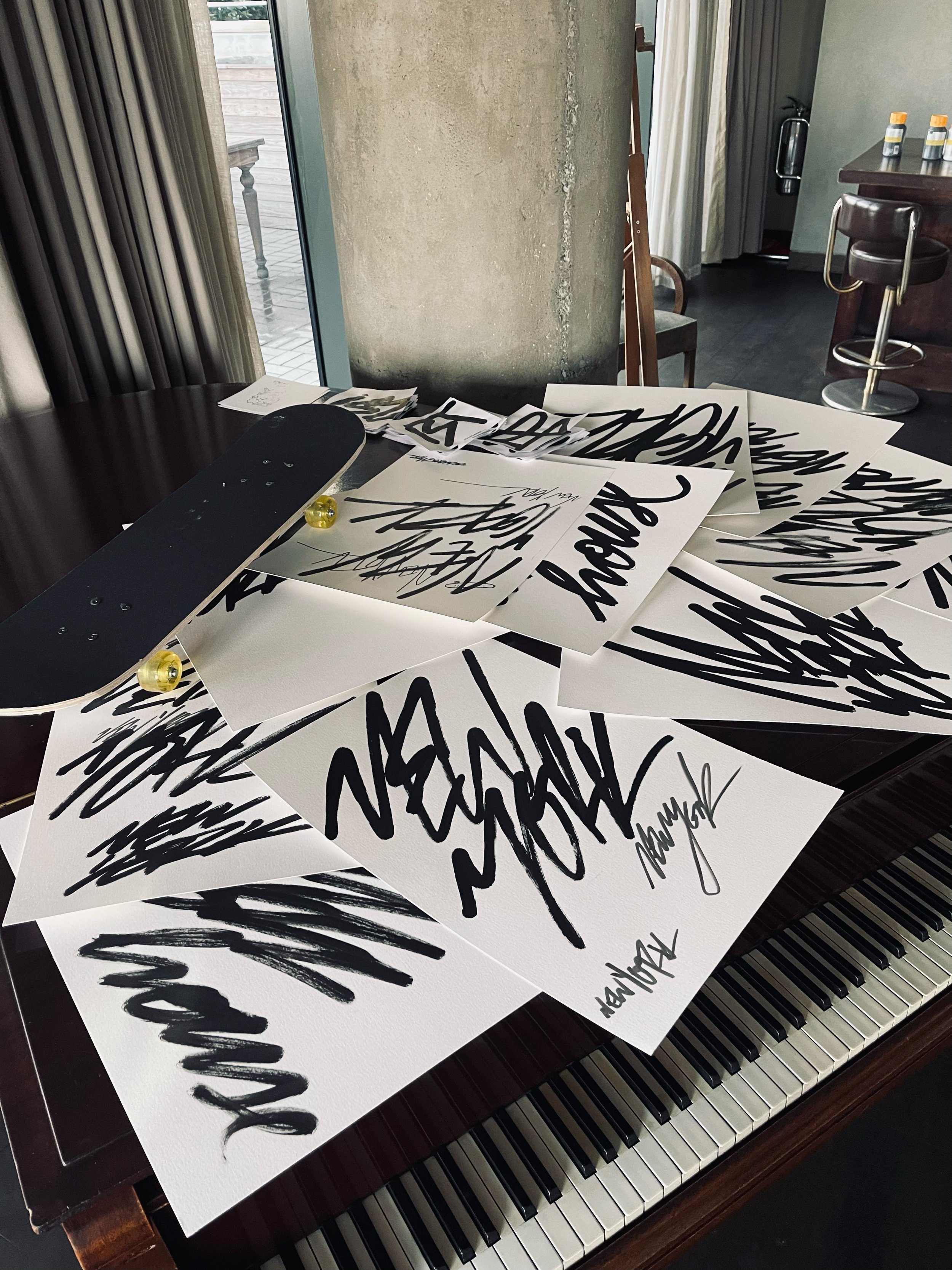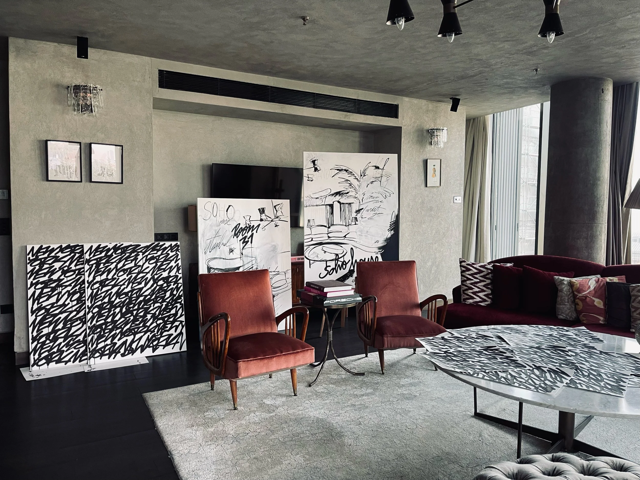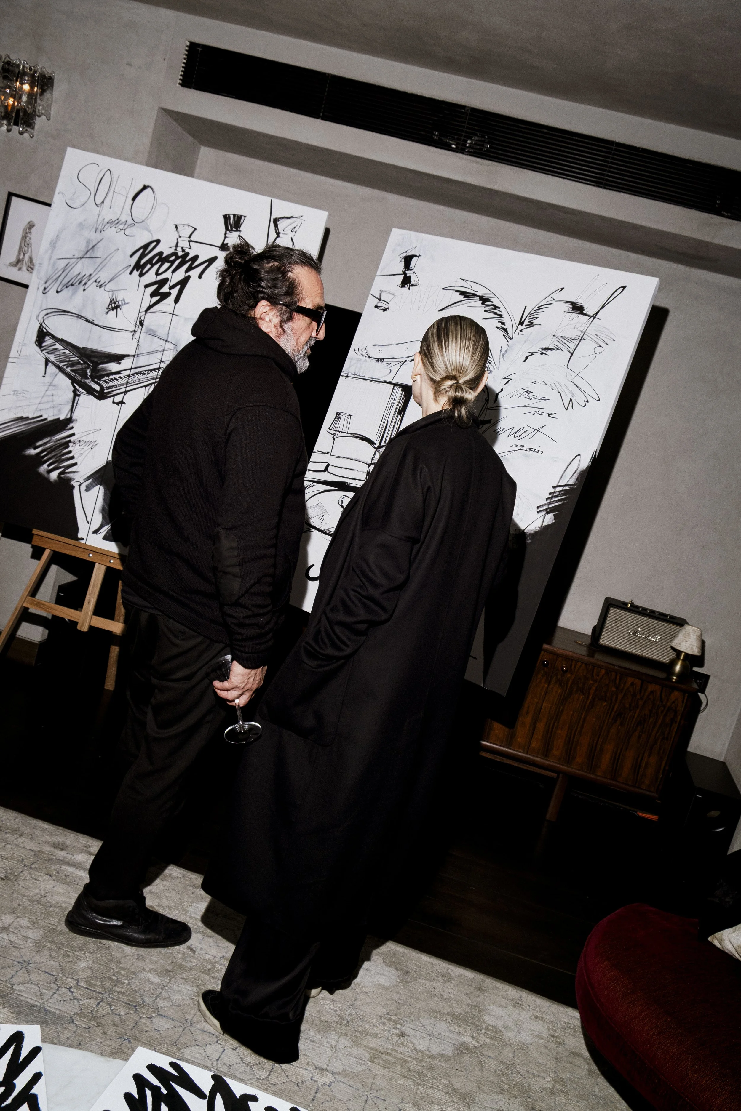 During their stay in The Apartment, the duo lived and worked in the space, using it as a temporary studio where the atmosphere shaped their decisions. Working across canvas, paper, and skate decks with acrylic, spray paint, markers, and lacquers, they explored the point at which a work feels complete or intentionally left in a state of becoming.The residency concluded with an exhibition held inside the apartment, opened exclusively to their invited circle and Soho House members. Guests experienced the works exactly where they were produced, supporting the collaborative nature of the project and the unique setting.Photos: Melih Ayakdas